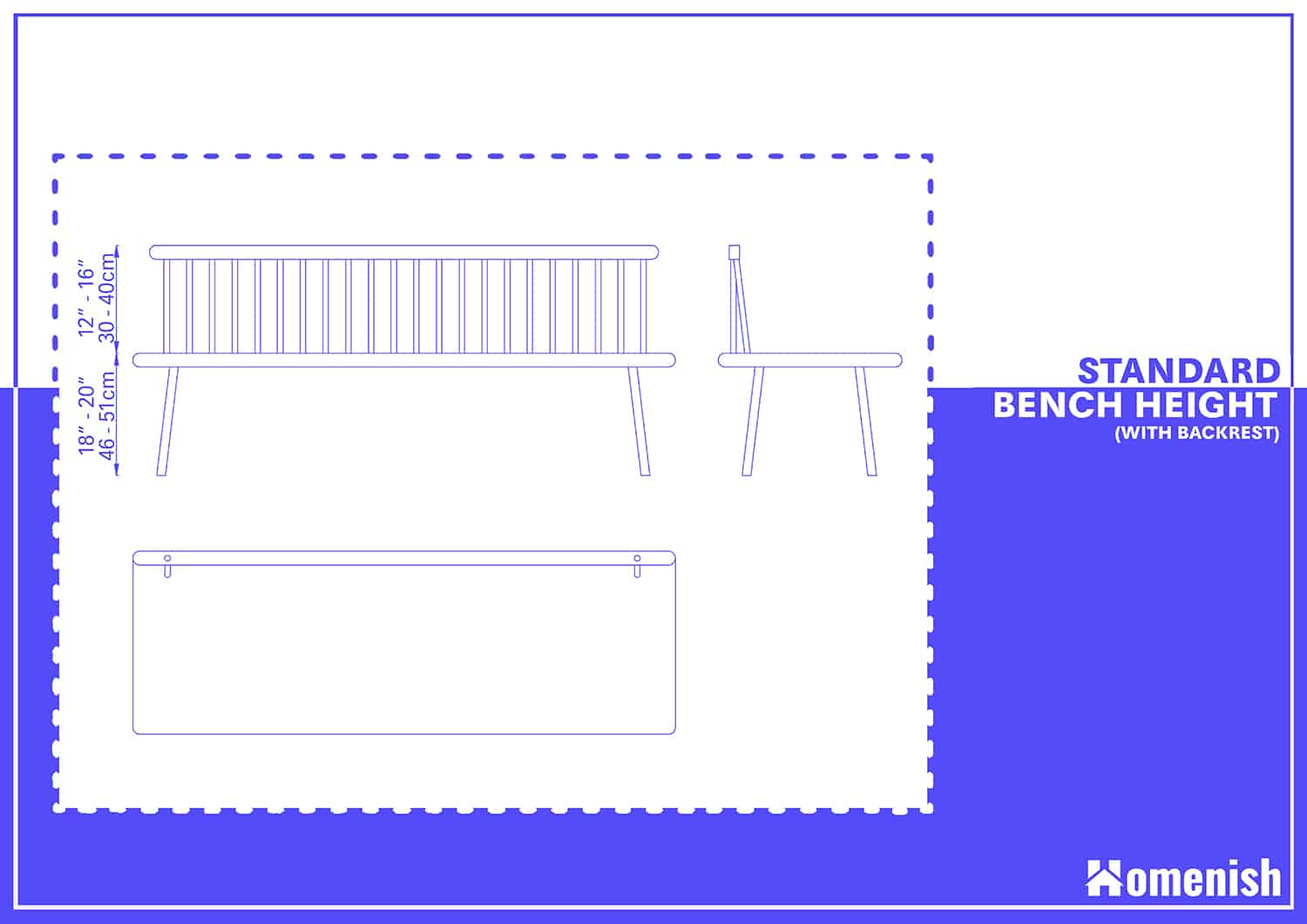 The height of a bench is typically between 18 and 20 inches 46-51 cm. The standard bench height is 18 20. For the seat depth try to stay close to 16 inches from the front to the back of the seat.